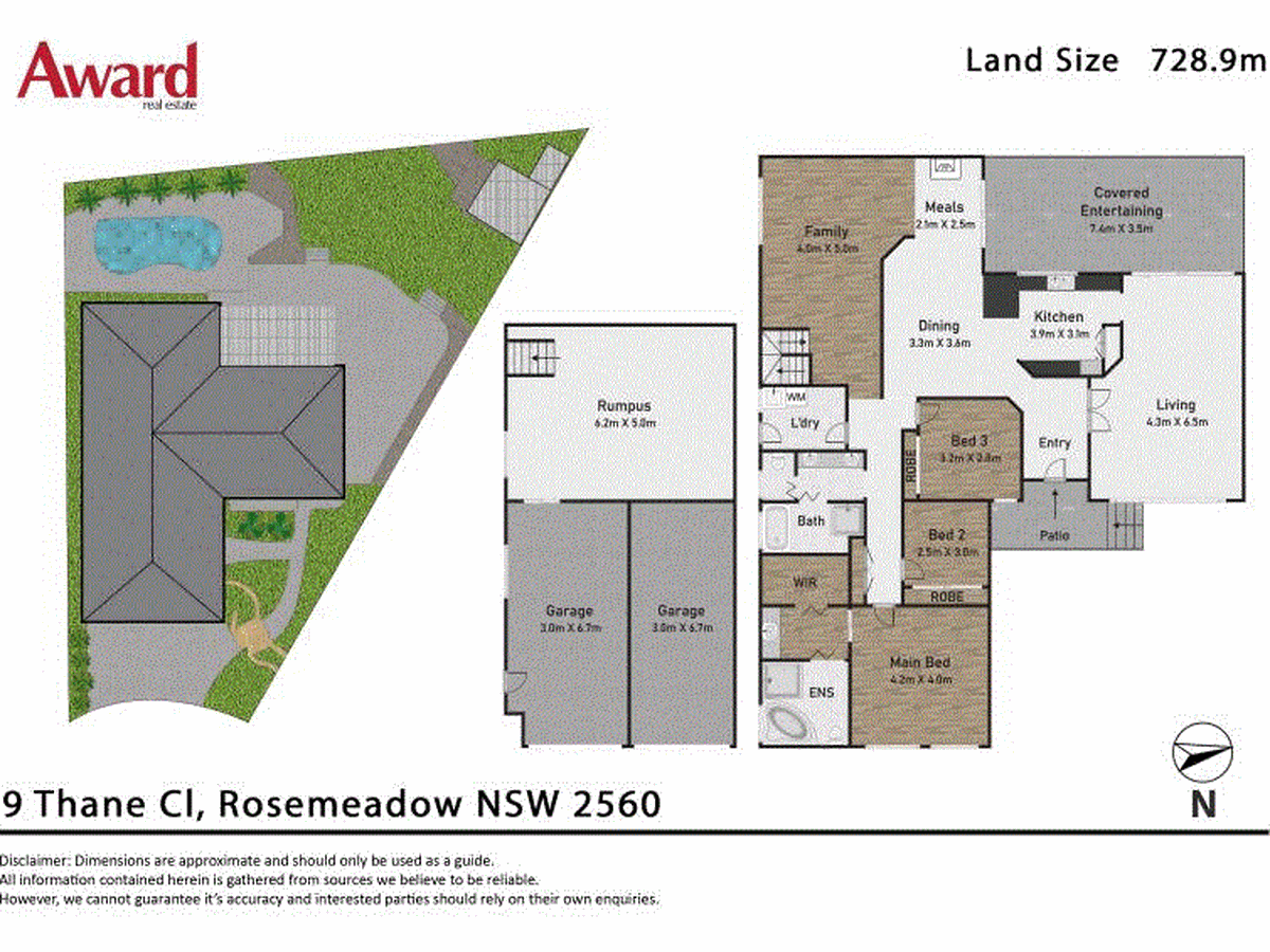 Award Real Estate proudly presents 9 Thane Cl, Rosemeadow. Located in a quiet cul-de-sac set on a large 728.9 m2 land is this family home featuring 3 bedrooms with built-ins, main with walk in robe with ensuite & spa. Also including: spacious lounge, separate dining & family room with combustion fire place, downstairs rumpus room, 3 way bathroom, double garage with internal access, kitchen with gas cooking, separate oven & dishwasher, gas heating, gas hot water, alarm, garden shed, ducted air conditioning. Covered entertainment area overlooking inground saltwater swimming pool & backyard surrounded by landscaped sandstone blocks. Minutes from the soon to be completed Campbelltown Billabong Parklands Project, Campbelltown Hospital, Macarthur Square Shopping Centre, Private & Public Schools with Public Transport nearby.